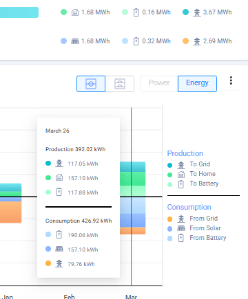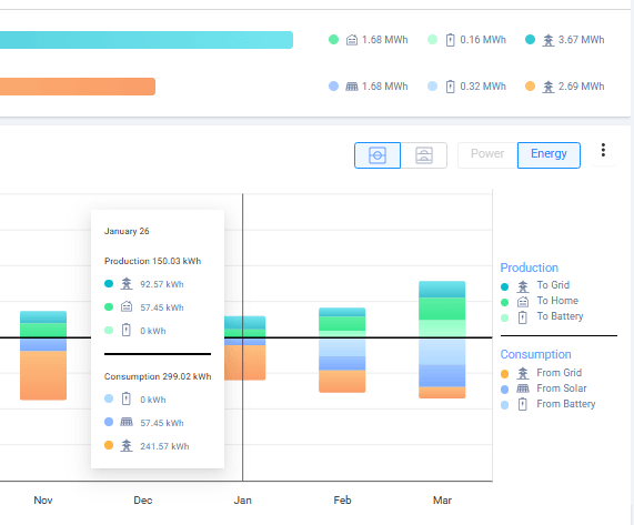 In March, grid import reduced to just 80 kWh, as more of the solar energy generated during the day was stored and used later. This demonstrates how battery storage can dramatically increase self-consumption and reduce reliance on the grid.